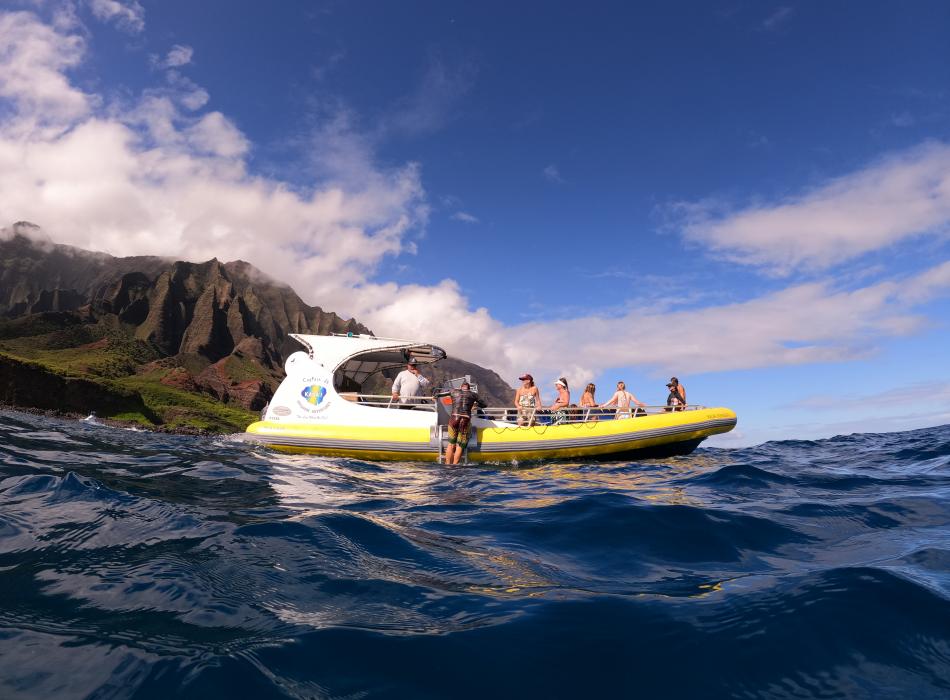 If you're looking for an Adventure along Kauai's Na Pali Coast, look no further than Captain J's. Our luxury super-raft departs daily from the calm waters of Port Allen Boat Harbor on the South West side of Kauai. You'll be able to see some truly breath-taking scenery and go snorkeling in places you never thought possible. We offer all the necessary gear for an enjoyable and safe day of adventure, such as snorkel masks, fins, wetsuits, and even a dry-bag for keeping your stuff dry. Our experienced captain and crew will provide you with incredible service that can't be found anywhere else in the islands. Whether you’re looking to go cliff jumping, take pictures of the incredible Na Pali coastline and sea life or simply relax in the sun, come join us and make memories that will last a lifetime. We guarantee you won't be disappointed! Book your trip today for an unforgettable adventure on Kauai's beautiful Na Pali Coast.